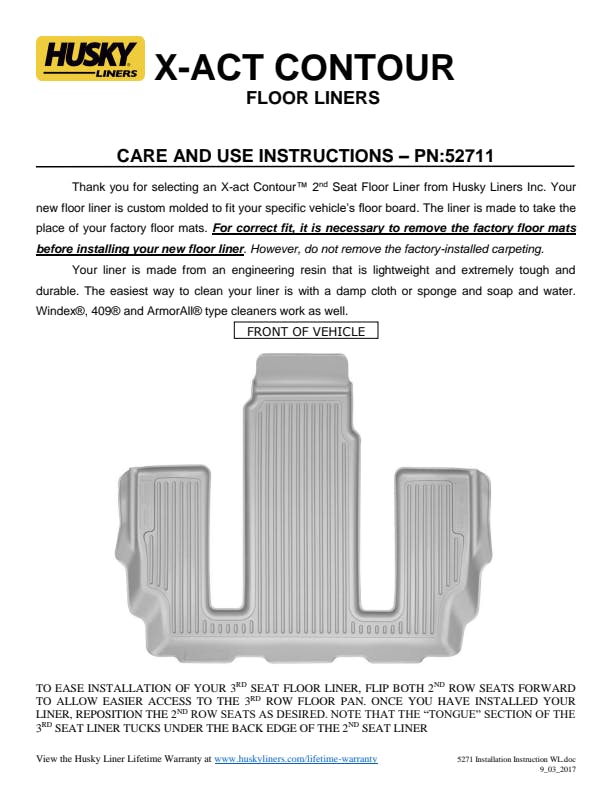 No hassle lifetime guarantee. For details: HuskyLiners.com/ForLife, Our FormFit Design™ process perfectly forms each liner to the detailed contours of your specific ride., With both softness and strength, our rubberized DuraGrip™ material was designed with comfort in mind., Our exclusive StayPut Cleats™ help keep your liners securely in place., Made in the USA., When we say it's "guaranteed for life" that is exactly what we mean. No hassles, no guff. If you have a problem with this or any Husky product, we'll replace it., Folds and molds for easy installation, removal and cleanup. Just yank it out, spray it down, and carry on., Proudly made in the USA., Our patented FormFit Edge™ is a raised ridge that runs along the door jam, protecting your truck or SUV from all manner of mess. |
